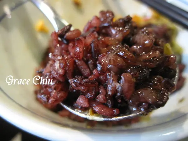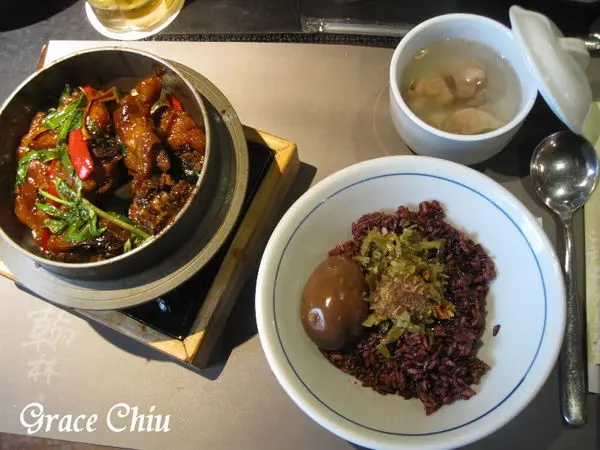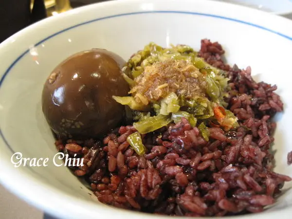 風味餐有附上清甜的排骨湯以及加了酸菜與滷蛋的飯,除了白飯也可以選擇更換為黑米哦,黑米吃起來比白飯多了一份帶點硬度的Q彈口感.