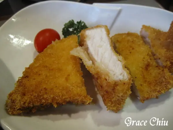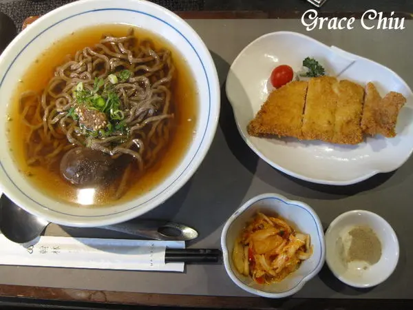 麵衣薄脆帶著厚度的豬排看起來好像有點乾但實際吃起來頗為嫩口,附上的沾料也是胡椒鹽…此外還有附了一些泡菜,不過泡菜不論是加在茶麵湯裡或是配豬排都好像不是那麼合搭.