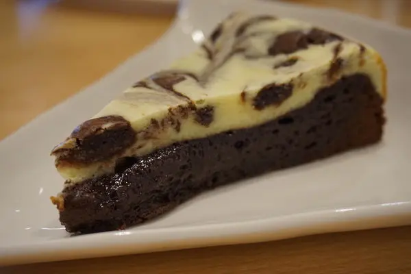 加熱後的布朗尼變得稍微濕潤,底層的巧克力蛋糕處於要融不融的狀態,