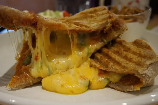 輕輕將兩片烤的酥脆的壓紋吐司分離,極富黏性的起司仍緊緊攀附其中;