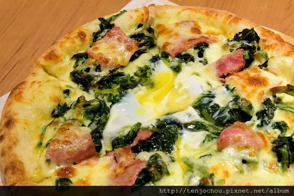 撲滿菠菜、培根、起司絲,再打上顆生雞蛋,半熟最好吃