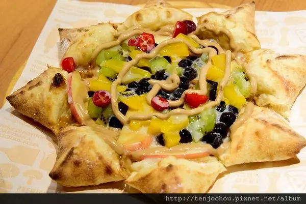星型披薩上鋪著滿滿水果,蘋果、水蜜桃、蔓越莓、奇異果品項不少