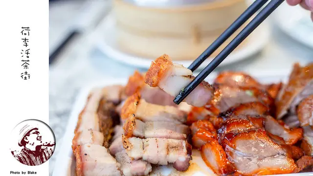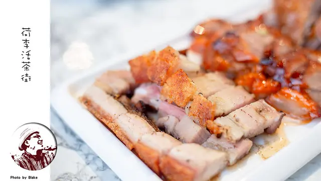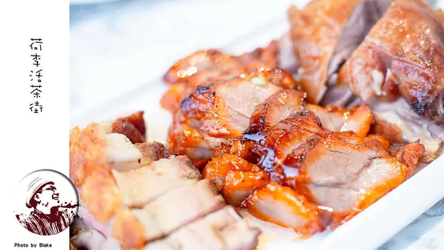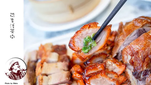 《荷李活茶街》燒臘是可以做成拼盤,總共有烤鴨、叉燒、燒肉、臘腸與油雞五種選擇,每盤是五選三,每份有分大跟小,其實想都沒想就直接點烤鴨與燒肉,這兩個做得好整個燒臘基本上沒有問題,然後叉燒是我個人喜歡的,結果完全沒讓我失望,化皮燒肉的精緻度完全不輸給我的愛店祥星,皮吃起來很脆,帶有肥的部份吃起來很有油脂,但不會膩,真超好吃的。