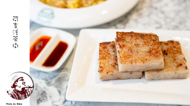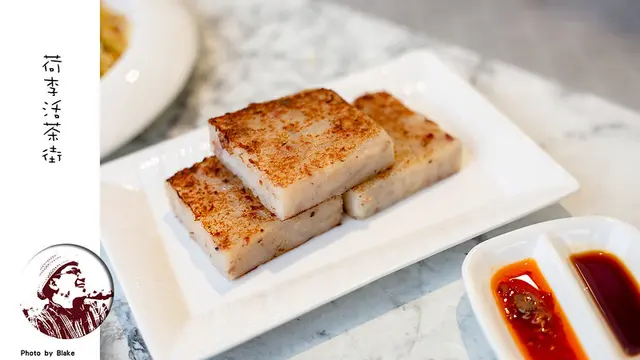 蘿蔔糕是那種蘿蔔絲超級多的蘿蔔糕,外層有煎到恰恰,內裡則是吃起來特別的香甜,特別的柔嫩,質地沒有那麼硬,單吃不沾醬就是好吃,然後《荷李活茶街》的辣醬也很棒,可是有一點偏鹹,會蓋過一些味道,建議吃完原味後再試醬料。
