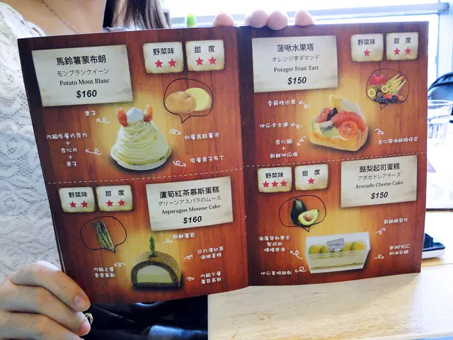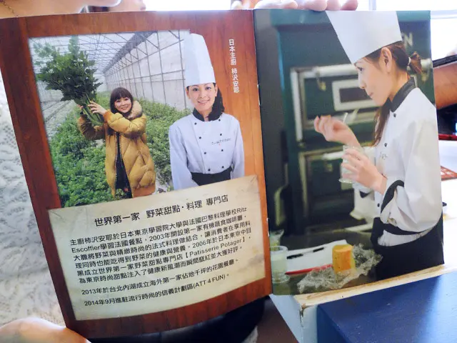 Menu 有介紹日本主廚柿沢安耶創立菠啾花園故事, 強調這是世界第一家野菜甜點專門店, 為甜點注入了健康新風潮