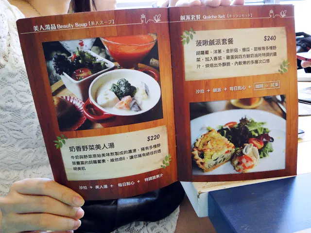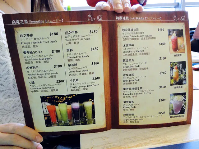 價格上套餐約在2百多, 甜點飲料單點在1百多元, 在台北信義區來說價格是還好. 不會太貴~ 每一頁介紹都很詳細, 野菜味和甜度都寫的很清楚