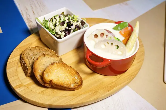 下午茶想吃鹹食的話可以試看看他們的 奶香野菜美人湯套餐 220元(沙拉 + 美人湯 + 每日點心 +特調果汁), 沙拉是新鮮蔬菜淋上胡麻沙拉醬, 甜甜芝麻香沙拉很醒胃呢~