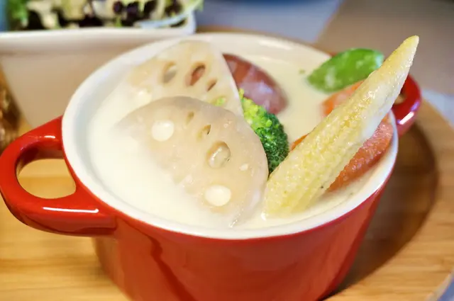 奶白色牛奶野菜濃湯是濃郁且不會有粉味, 加上多種蔬果有豐富維他命B等, 喝了感覺有變美人了
