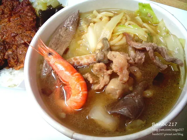 麵條有Q勁,料多實在,有蚵仔、蝦子、魷魚、豬肝、小顆的虱目魚丸、瘦肉、高麗菜、木耳。