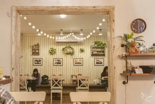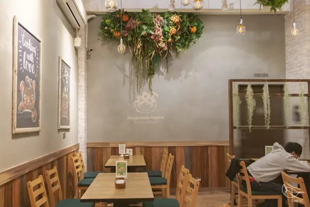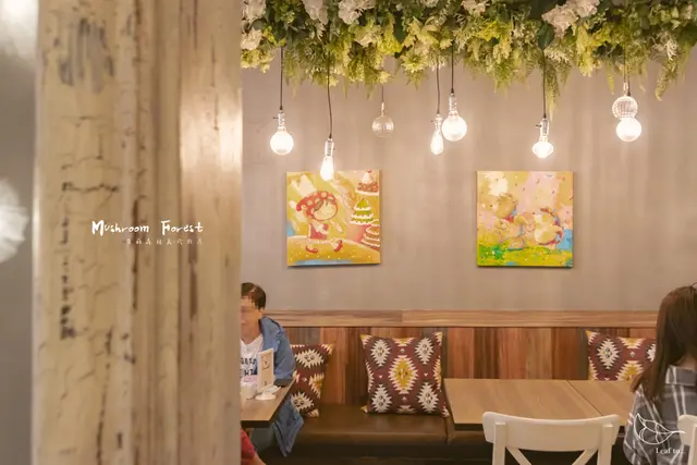 店面及整體空間與之前的店面空間相同,呈現出猶如繪本一般的鄉村風格;本身學習美術的老闆發揮所長,將自己的繪畫作品放置在店裡展示,還製作了招牌吉祥物的蘑菇女孩公仔在門口招呼客人,搭配上以木質調性為主的空間呈現,讓整家店看起來就像是童話故事繪本裡會有的可愛場景,每一個角落,都充滿著舒適暖心的氛圍。