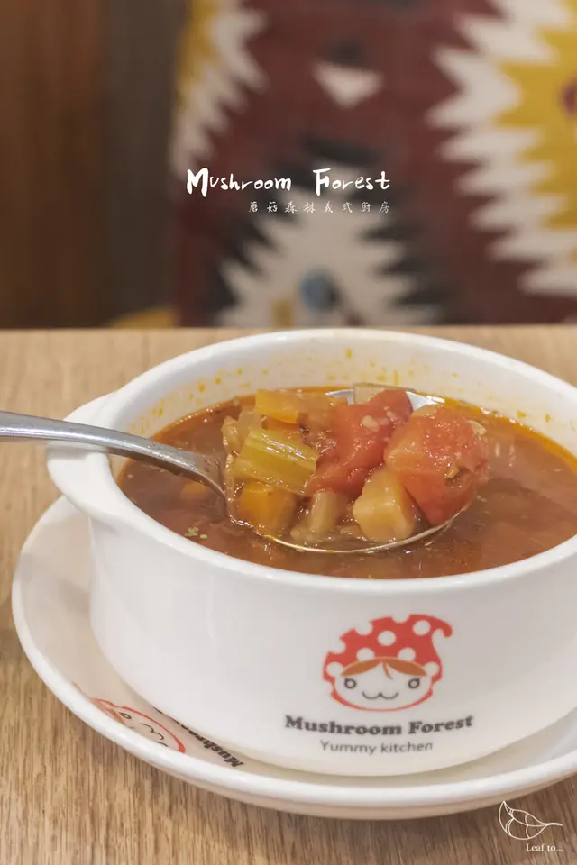 雖說是套餐內容,我選擇的蕃茄蔬菜清湯也可真是一點都不馬虎,湯底除了濃郁的蕃茄之外,還可以喝得見蔬菜熬煮過後的清甜口感;並且內裡湯料還有豐富的蔬菜切塊,光是這樣一個前湯,就已經讓我們滿足地開了胃。