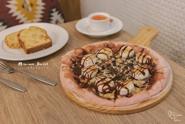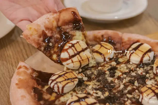 或許是妹妹E.T. 曾經在其他地方嘗試過甜披薩感到喜歡,所以當看見蘑菇森林有提供甜食品項的披薩時,二話不說立刻選擇了棉花糖榛果巧克力口味。此外,我們將麵糰換成草莓麵糰,讓整個披薩餅皮呈現粉紅色的,小小地滿足妹妹難得的少女心(笑)