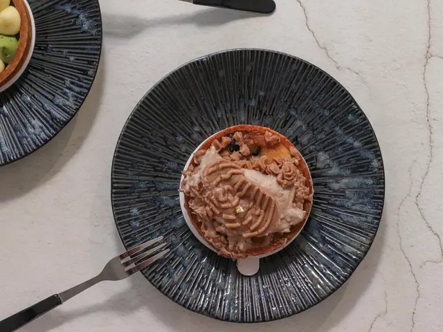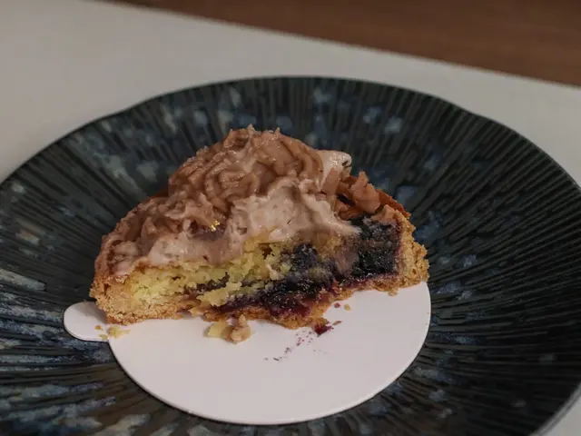 底下是杏仁奶油餡與微酸的自製藍莓果醬,雖然栗子與莓果也不是常會被搭在一起的東西,但這個組合我覺得比向陽好些,幕斯類的蛋糕比較容易產生膩感,梅果醬的酸甜恰巧中和了味覺與口感,口味算是協調,整體來說還不錯。