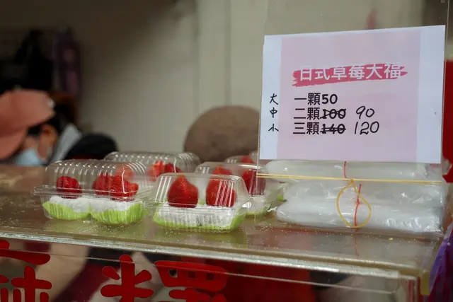 草莓大福價錢是依草莓的大小來區分,最大顆一顆50元,中等的兩顆90元,小顆一點的三顆120元,這樣均價才40元,真的很便宜。