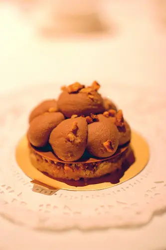 “伯納德自己最愛的是陳年櫻桃白蘭地風味圓糕,在眾多甜點中,這款蛋糕頗具份量。還在拍照時,發現這個蛋糕居然很濕,濕到紙墊都軟透了。公關說「因為蛋糕體浸潤過白蘭地糖漿,不過你試看看,這蛋糕雖然濕潤,卻不糊爛。」”