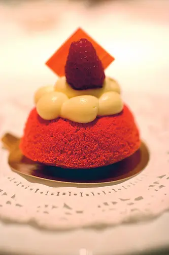 國外的巴巴有些是做成球狀裝在玻璃瓶裡外賣,多半都是浸蘭姆酒等等稍微比較便宜的烈酒,而這位法國主廚,將巴巴精緻化,特別使用陳年櫻桃酒,Mascarpone 起司,將粗廉的 Rum Baba 轉換成精緻的形式,結果被一群不懂的人”好心建議”給完全毀了。