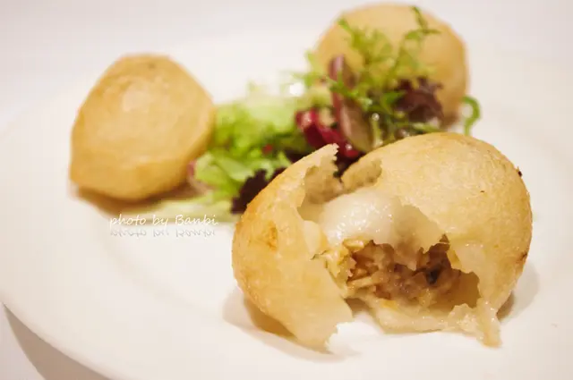 因是糯米炸成,所以吃起來會像包了麻糬的口感般Q軟卻不黏牙。裏頭有香菇、叉燒、筍子、鮮蝦,口感上為多層次的感受,先是細緻的酥脆外皮→如同麻糬般QQ的糯米→香氣四溢的內餡料吃起來也脆脆的。