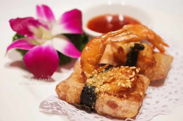 成分為芋頭、鮮蝦、海苔,作法也是用炸的,一旁搭配的醬汁是類似酸甜辣醬的感覺。