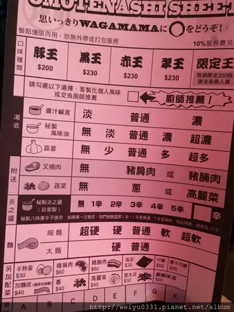 接著,和你們介紹菜單的選擇,豚王、黑王、赤王、翠王、限定王,五種口味當然也有限定款,限定王每週只有200碗哦!!!