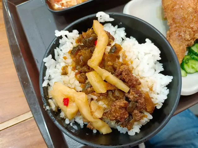 飯類裡頭包含一個主餐,一碗魯肉飯,三樣小菜,配色度看起來滿不錯的~
