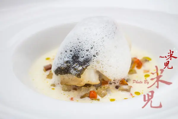 2580晚間套餐熱前菜,清蒸野生比目魚,搭配的是鮮鮮巧達醬汁與牛奶泡泡,襯托出魚肉的嫩度和甜味。