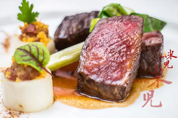 2580晚間套餐主菜之一,香煎美國和牛肋眼,看切面就知道這牛肉很軟嫩甜美,配菜油封馬鈴薯也很可口,再搭配烤過的宜蘭三星蔥增加口感的豐富性。