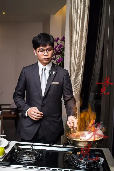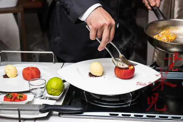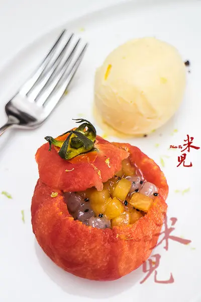甜點是桌邊服務呢!這是只有2580晚間套餐才能選的火焰水果番茄盅~