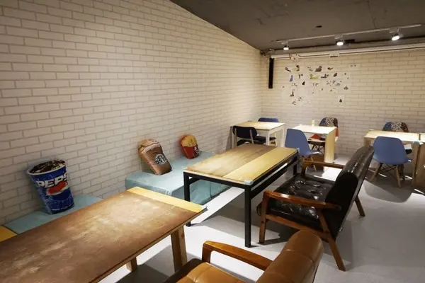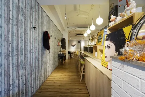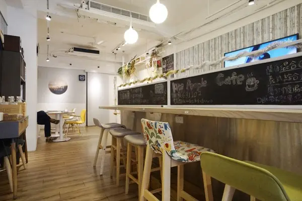 一樓映入眼簾的是一條狹長的走道,右邊是櫃檯兼廚房,繼續往下走則是吧檯區以及座位區
