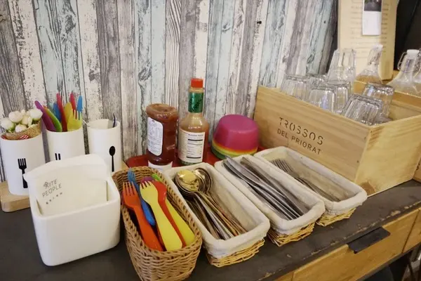 餐具、醬料和水是自取,小孩子的碗及餐具也都有