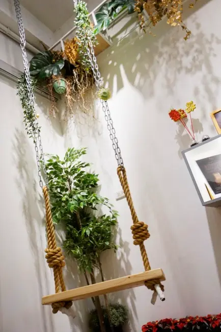 我好喜歡在室內空間加入鞦韆這個元素,不過……這個似乎沒辦法真的盪起來(會撞到後面的牆壁),閒來無事坐在上面微微晃動應該是還可以