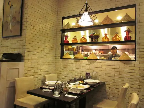 店內佈置溫馨,昏黃燈光與純白色調牆面,簡單的民俗壁畫和帶有越南風情的斗笠擺設,看起來更有異國風味。