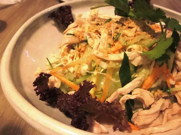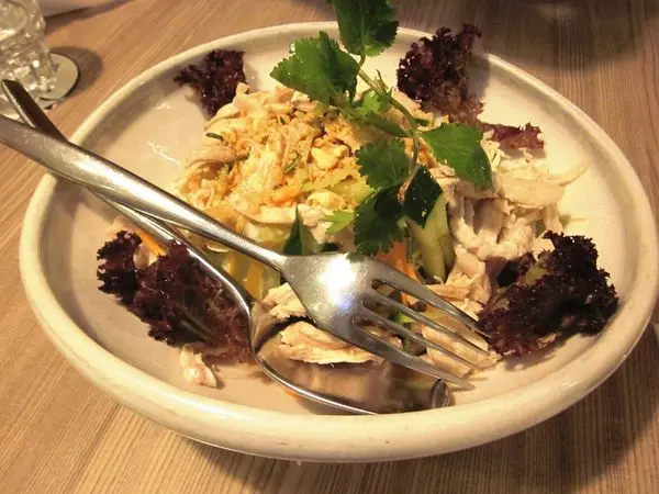 越式涼拌雞絲。雞絲沙拉份量還蠻大的,適合兩三人一起分食。鮮嫩的雞肉絲加上紅蘿蔔絲、小黃瓜和九層塔,上頭還灑了些花生粉,然後碗裡還有酸甜的越式魚露醬汁,攪拌一下再吃,清爽酸甜的口感,十分開胃呀!話說花生粉灑多一點或許味道會更好喔。