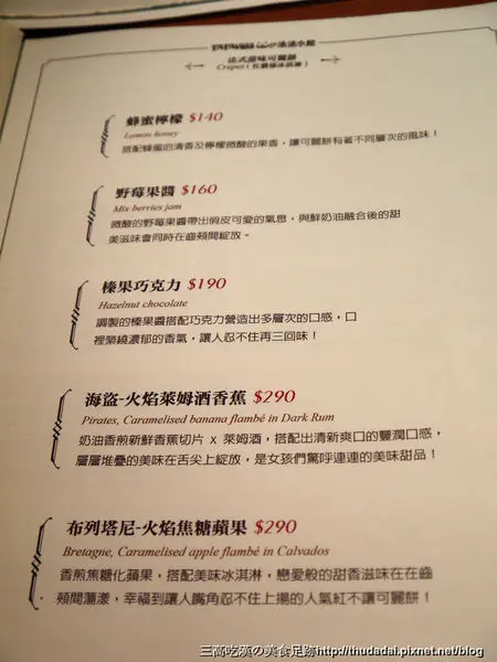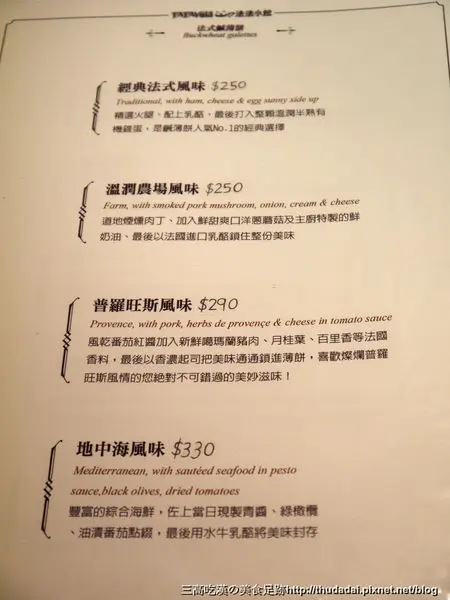 店內餐點走樸實的家常路線,尤其聽說法式薄餅滋味好且道地,除了鹹甜薄餅以外,
