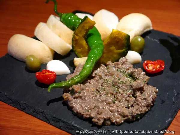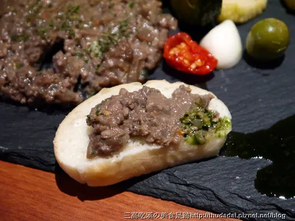 是一道蠻有趣的開胃菜,原先是做成法式肉凍的型態,為了方便抹於麵包上,