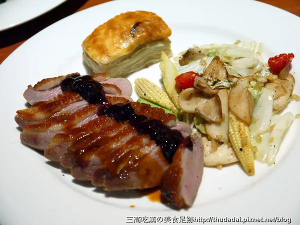 沾上一些莓果醬汁的酸甜味也是另一種樂趣,旁邊的玉米筍高麗菜也好吃。