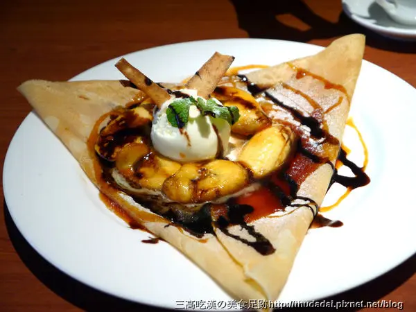 上頭是奶油煎香蕉片與香草冰淇淋、巧克力醬,上桌前還會淋上蘭姆酒點火釋放香氣,