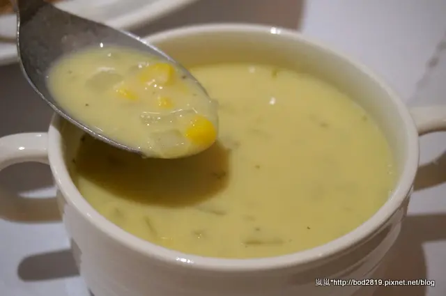 湯裡面有玉米跟洋蔥,味道甜甜的