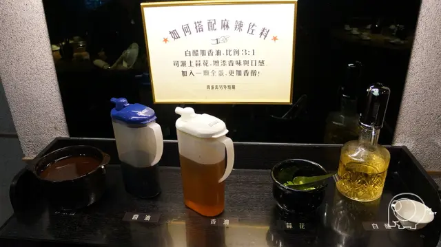 詹記的沾醬不多,從左到右分別是沙茶醬、醬油、香油、蒜花、白醋這五種而已,應該是對自已的麻辣鍋很有信心才會這麼少種,E說是這樣的嗎,我說要相信專業,我就拿點蒜花加白醋。