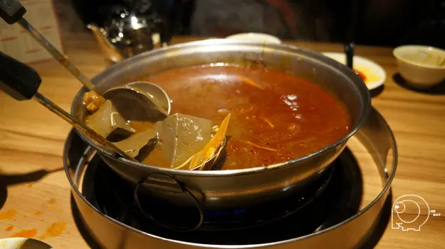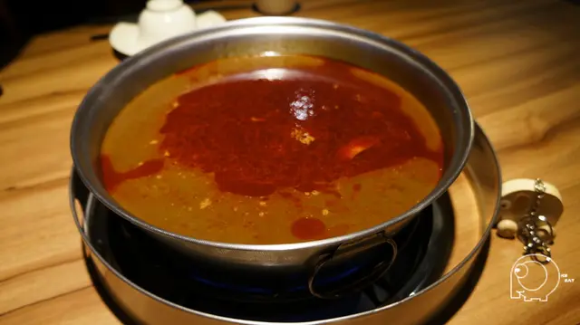 麻辣鍋上來了,上面有一層紅紅的辣油看起來很辣,不過有聞到一股香味。