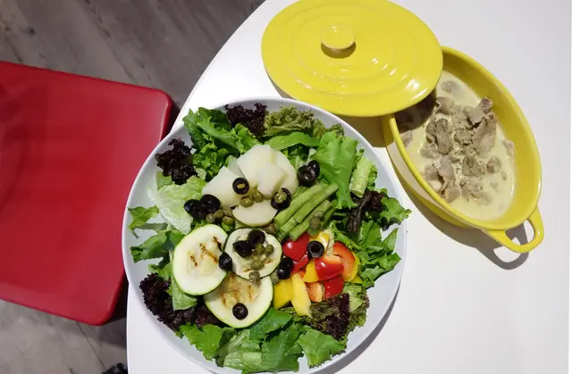 綠咖哩嫩豬沙拉的沙拉包含了非結球萵苣(蘿蔓)、紅捲萵苣、綠葉萵苣、馬鈴薯、烤櫛瓜、甜椒、黑橄欖、四季豆、酸豆。