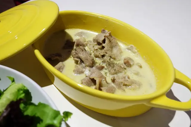 醬汁比一般印象中的咖哩再稀一點,比較像是湯咖哩,味道則帶點辛香料香氣及微辣口感,搭配沙拉吃別有一番感受。