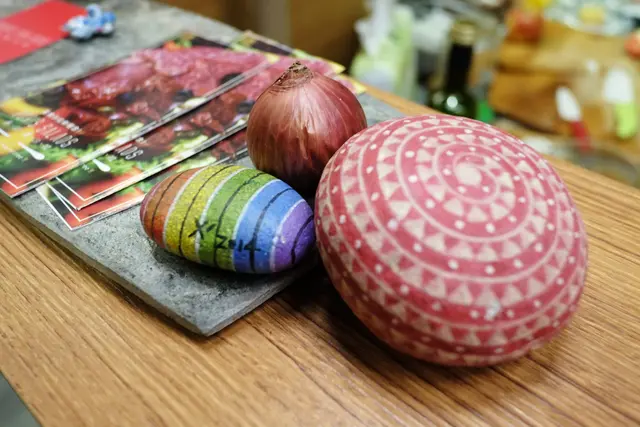 櫃台上彩繪石頭旁也有迷你小洋蔥。