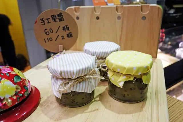 販售的手工果醬亦用不同花紋的布料搭配麻繩來包裝。