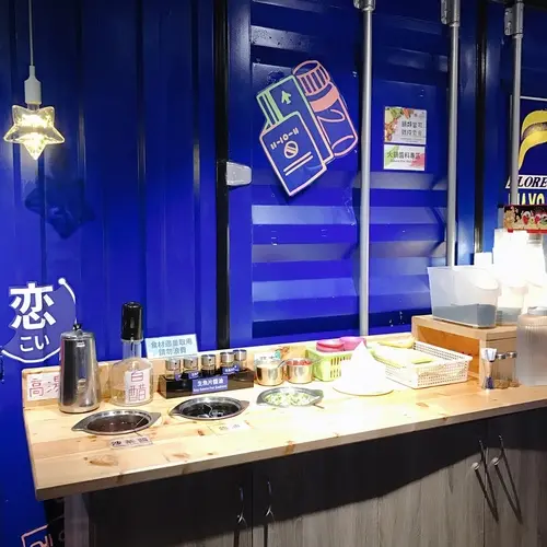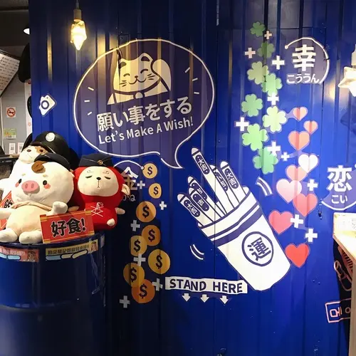 *🔸自助醬料區的旁邊設有拍照區,是鮮藍色的背板,上面畫祈福貓和許多好籤圖示,店家還貼心準備許多隻可愛的大玩偶和帽子供拍照用呢! ⠀⠀⠀⠀⠀⠀⠀⠀