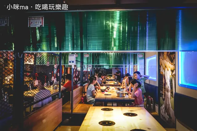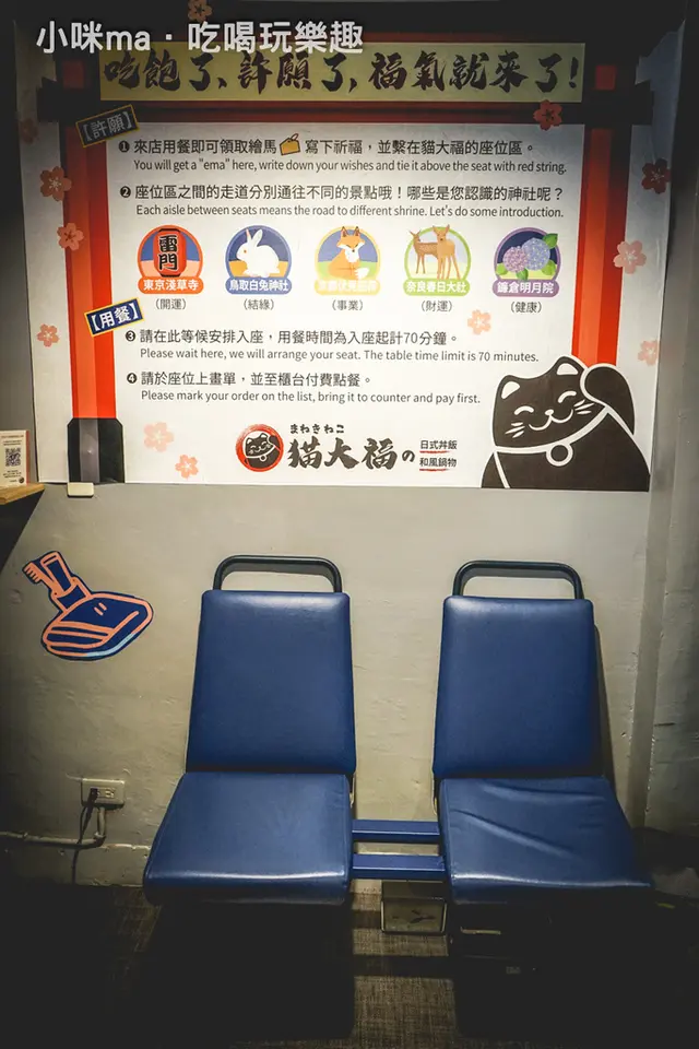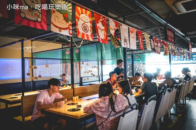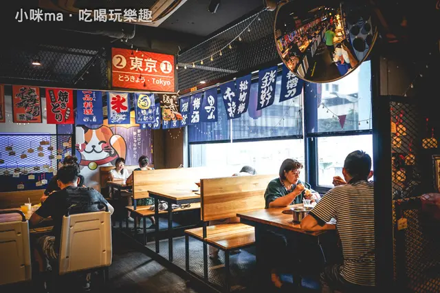 座位做成日本電車車廂的概念,掛上活潑的日文旗幟,散發滿滿的日本氣息