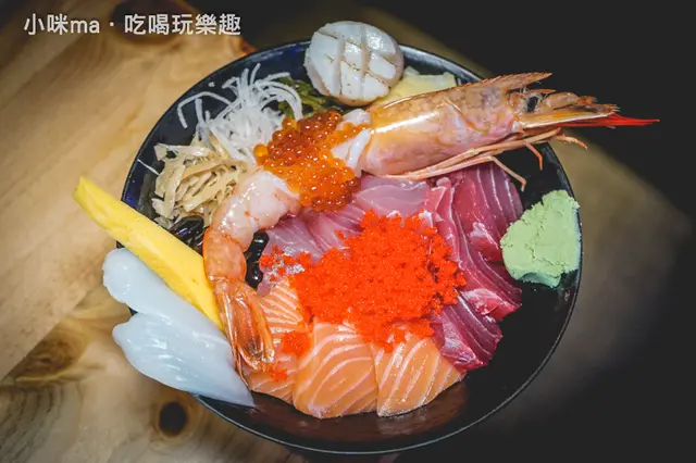 想要膽固醇爆表就點這一碗,上面有天使紅蝦、花枝、鮭魚、旗魚、鮪魚、干貝、魚卵⋯⋯這樣也只要380元
