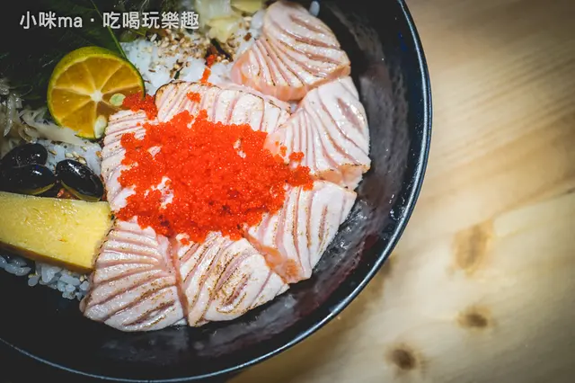 百元小資價也能吃到滿滿的炙燒丼飯,6~7片的炙燒鮭魚排排鋪成粉橘色的地毯