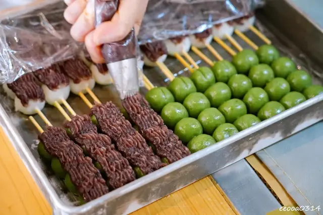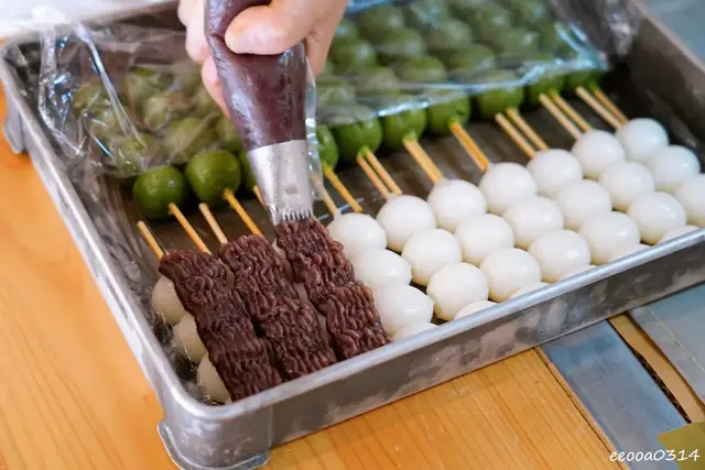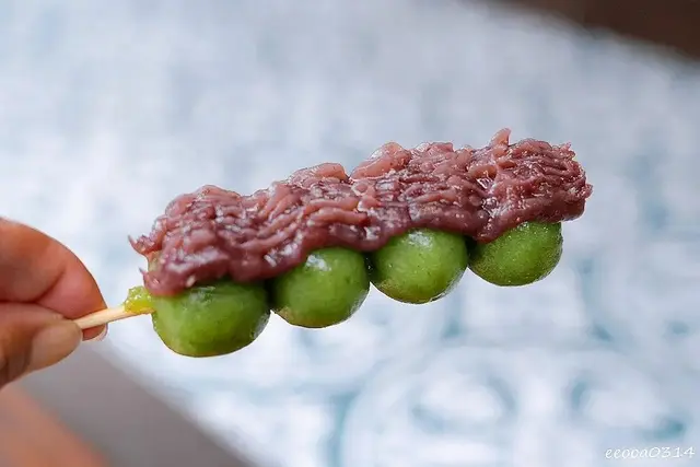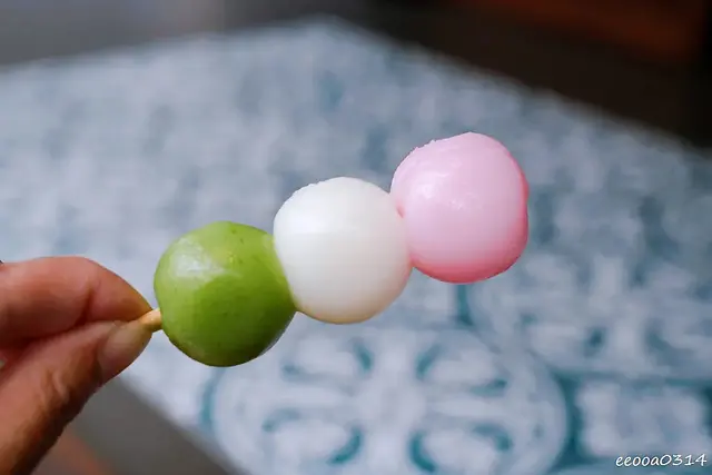 粉紅、白、綠三色一串,視覺超療癒。口感Q彈,帶有自然米香,是少女心大爆發的人氣選項!