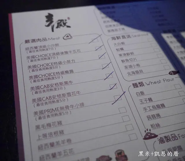 勾選的餐點很快就送到了,MENU貼心地印上每種肉品的建議熟度,大家涮肉片時可以參考
