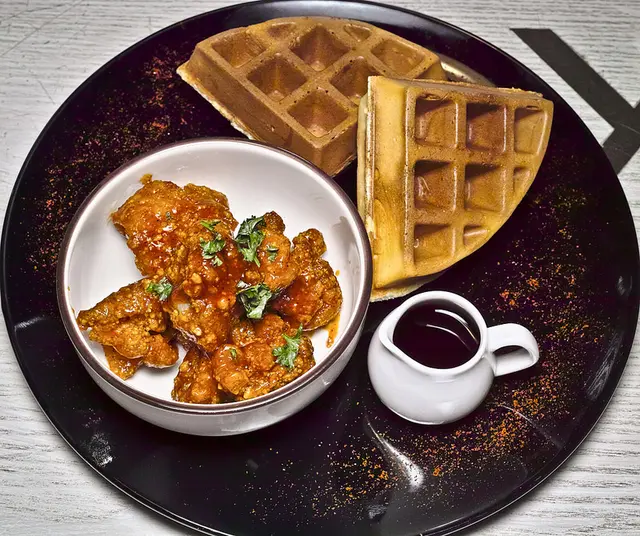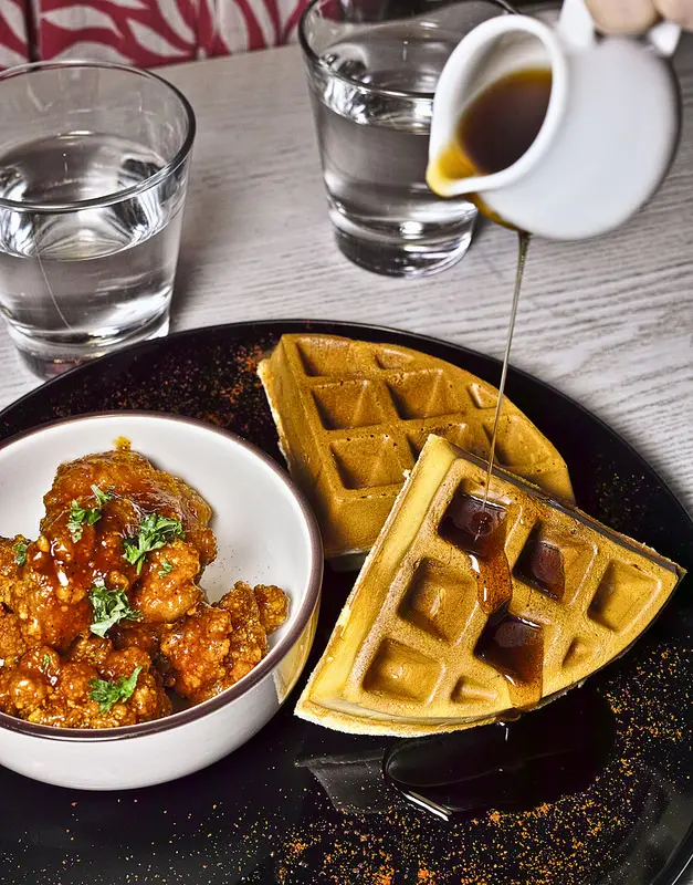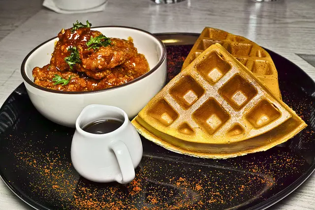 炸雞配鬆餅? 好像有點特別, 對美國人就不太特別, 美國南部還蠻常這樣吃的